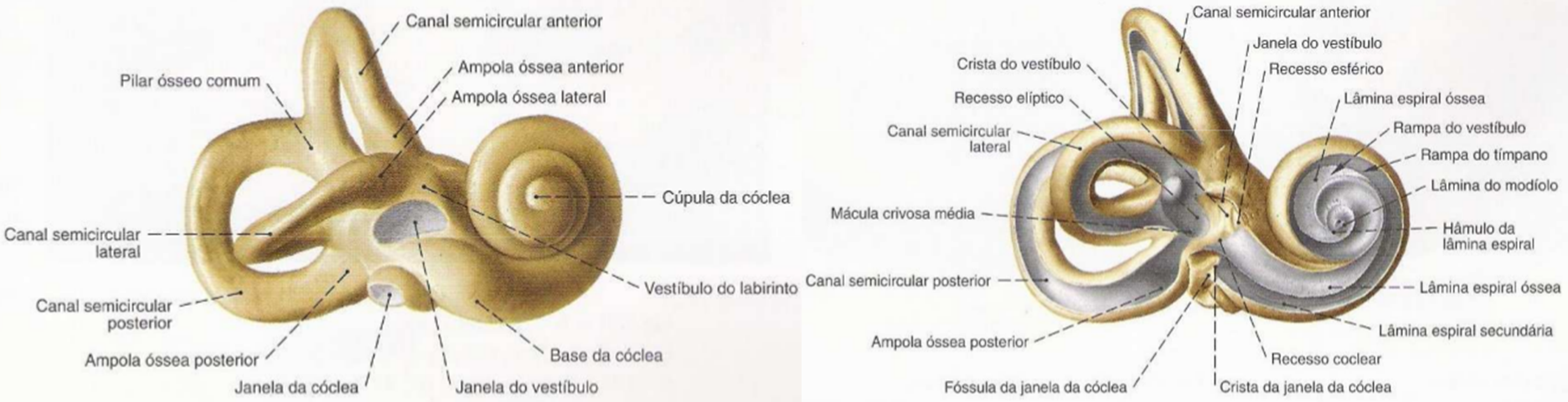 ântero-lateral do labirinto ósseo e, à direita, vista ântero-lateral do