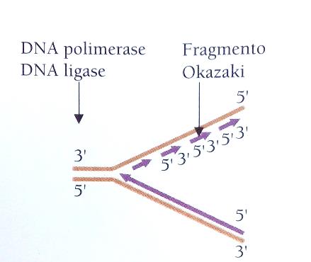 contínua (5’ – 3’), a outra cadeia – lagging, é sintetizada de
